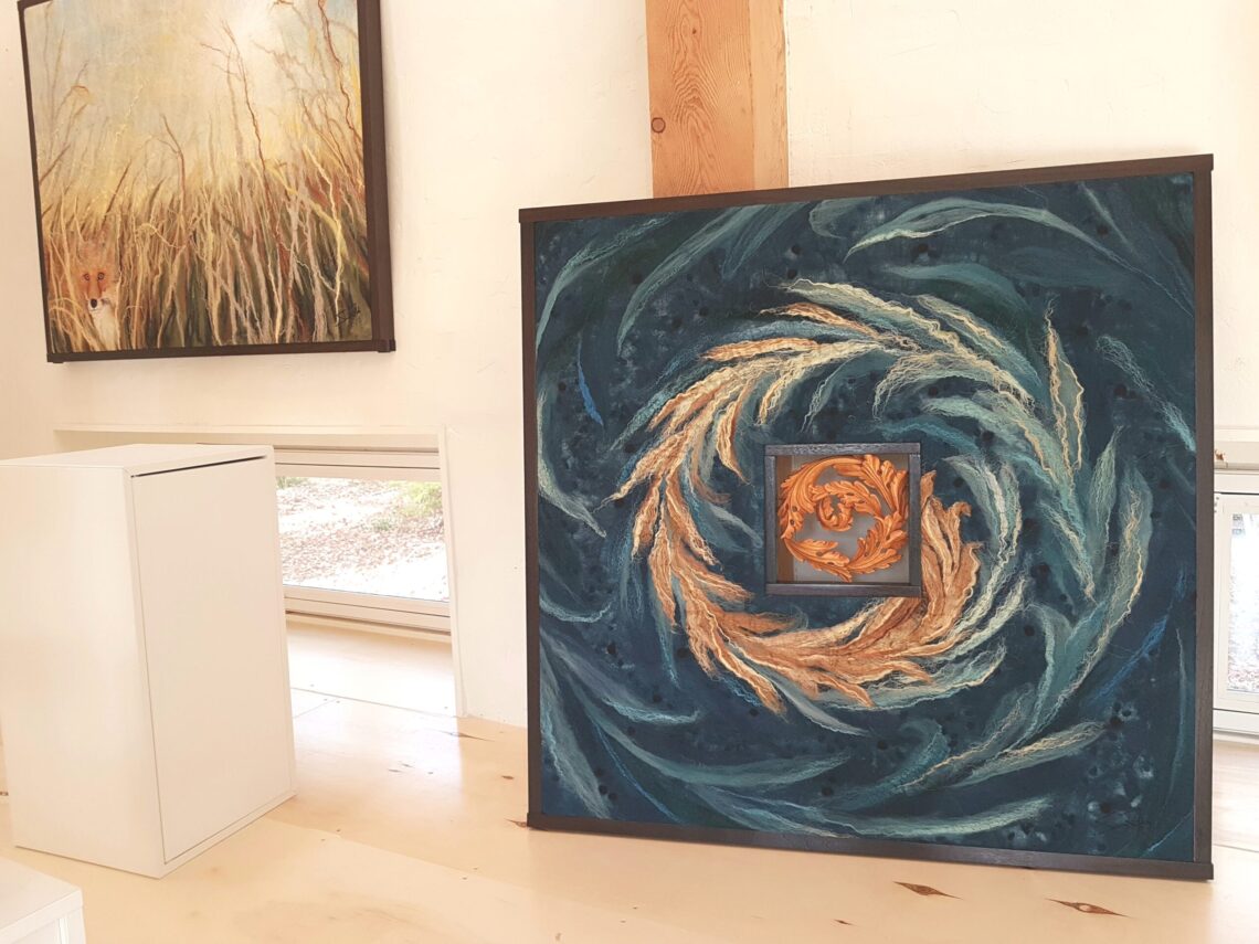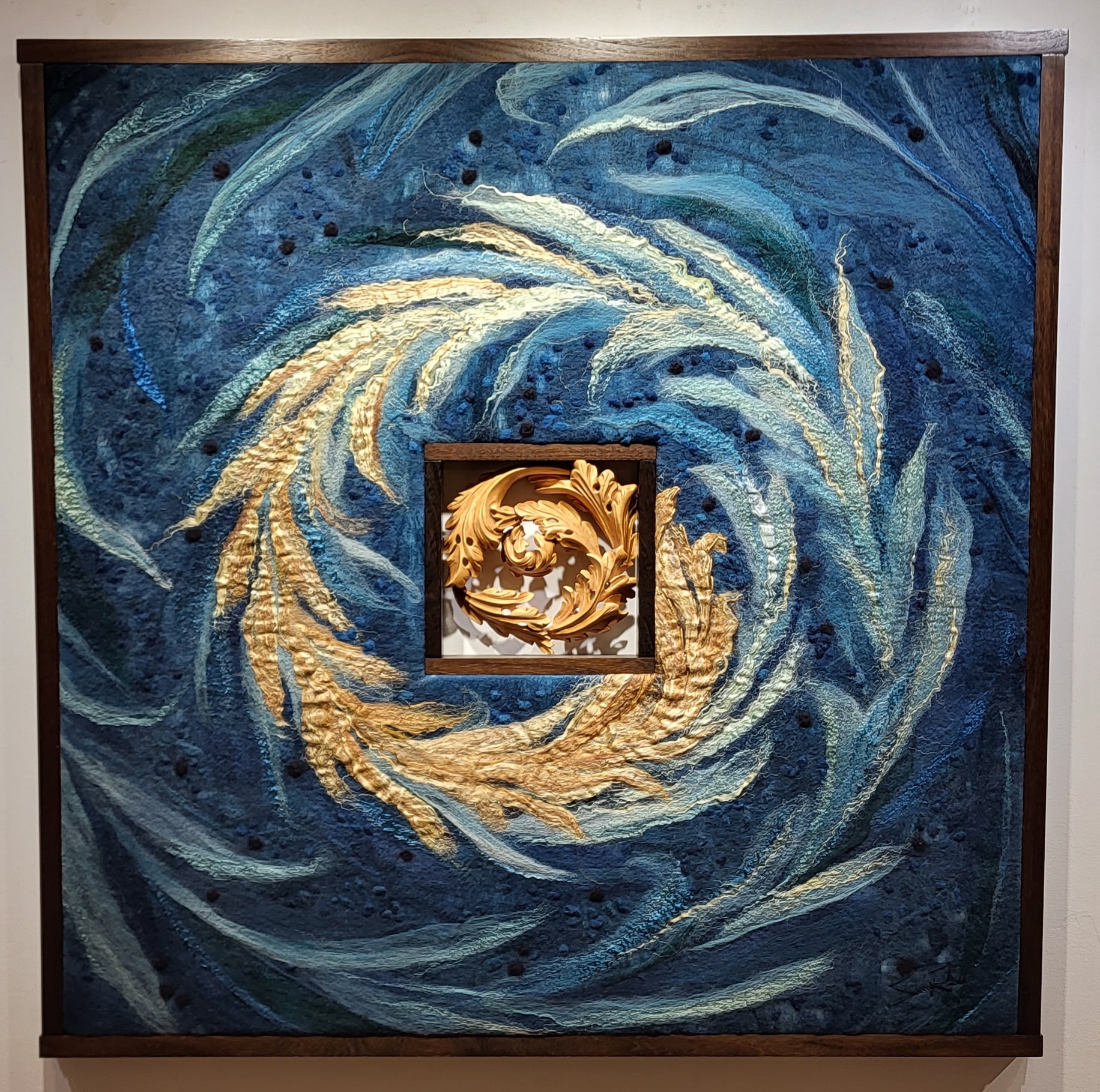 Created by Sanna Rahola using wool, silk, linen and mohair with in a bespoke pickled black walnut frame and a white birch carving detail created by Douglas Drdul.