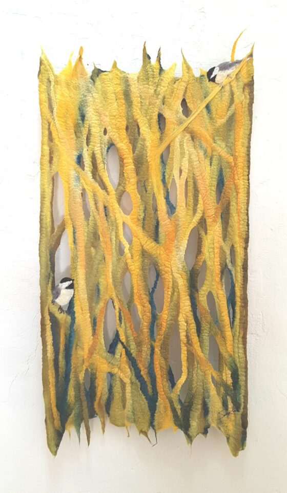 Created by Sanna Rahola using hand dyed merino woo,silk and cotton with a bespoke black walnut bracket by Douglas Drdul.