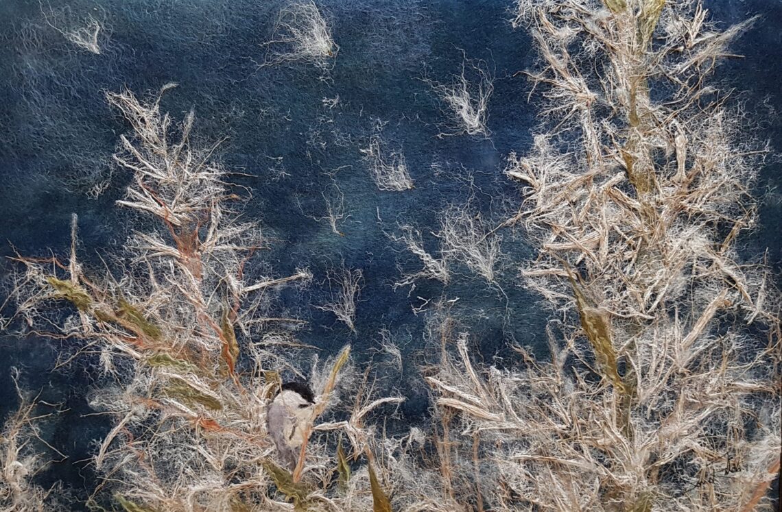 Created by Sanna Rahola using wildcrafted Fireweed fibers, merino wool, silk, linen and mohair with in a bespoke pickled black walnut frame by Douglas Drdul.