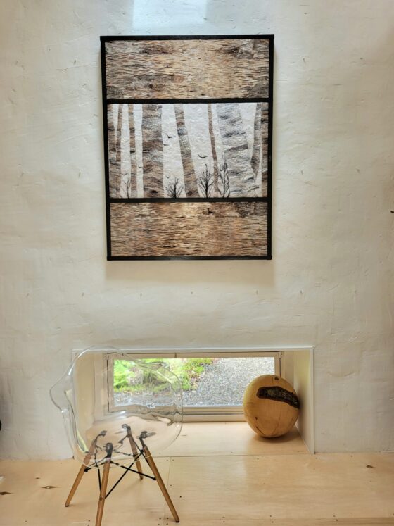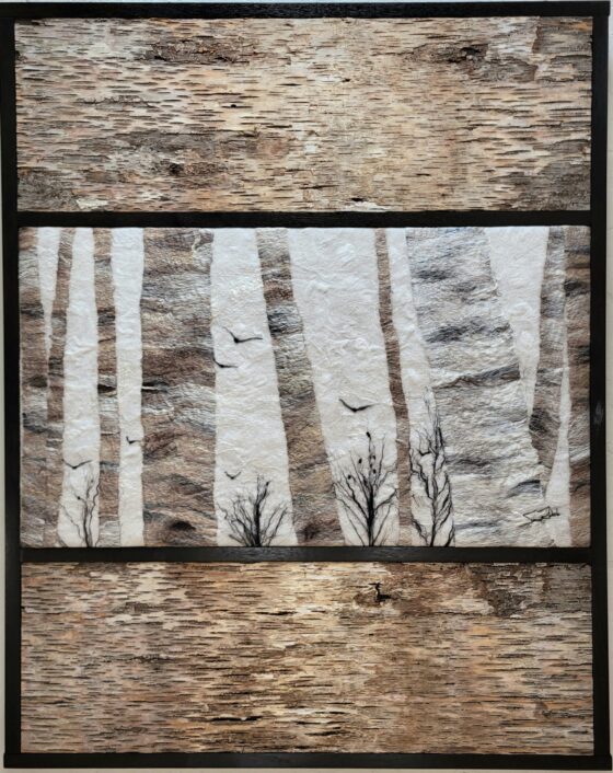 Created by Sanna Rahola using hand dyed wool, silk, mohair and linen with birch bark details within a bespoke pickled black walnut frame created by Douglas Drdul.