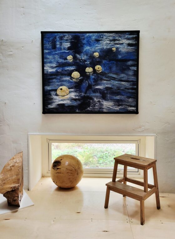 Created by Sanna Rahola using hand dyed wool, silk, mohair and linen with in a bespoke pickled black walnut frame created by Douglas Drdul.